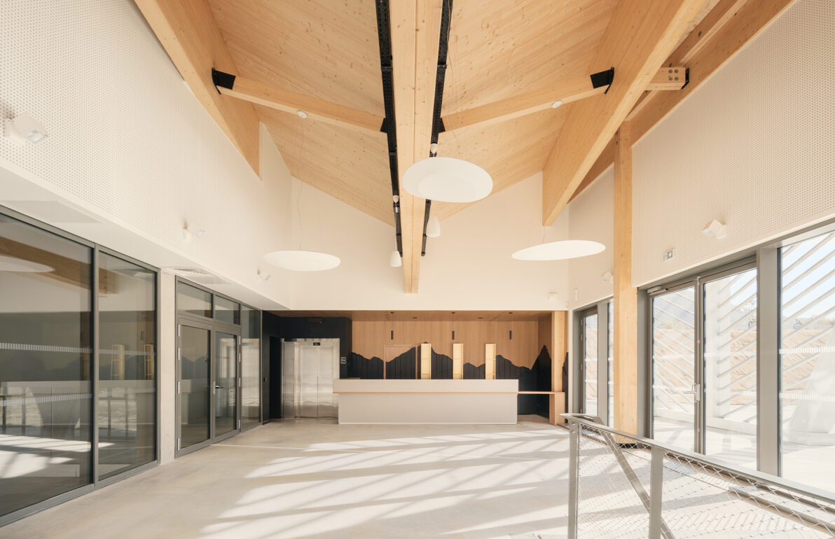 Enraciné dans son environnement, le projet privilégie l’emploi de matériaux biosourcés issus des ressources locale (bois de la filière Bois des Alpes, avec 24kg/m², équivalent au niveau 2 du label bâtiment